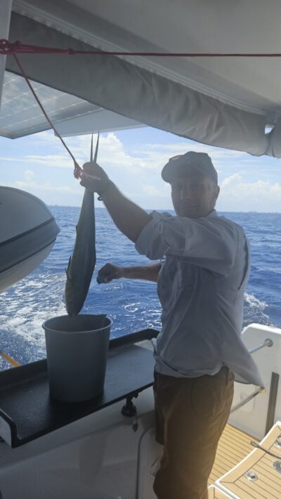 It was smooth sailing as we cruised with the gulf stream along the Florida coast. Fred had brought a fishing pole and some lures, he cast it out in the wake of the boat and managed to attract a mahi mahi.