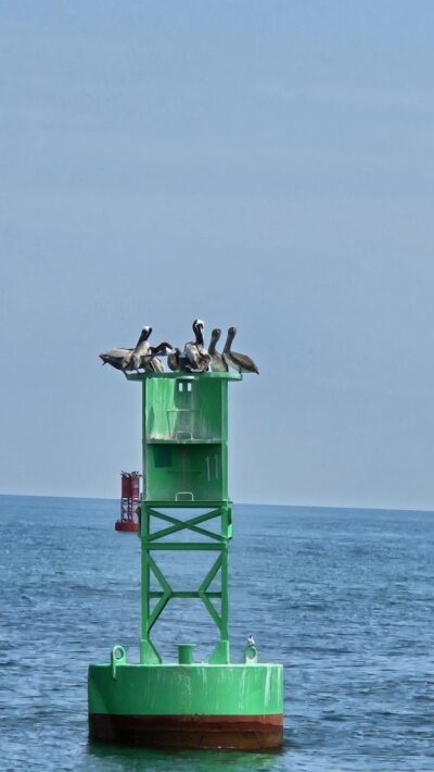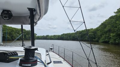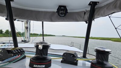 The biggest thing I didn’t like about transiting the ICW was the bridges. The bridges over the waterway aren’t all drawbridges. There are some of those, but most of them are fixed bridges that are all at 65 feet off the water. Of course that height varies depending on whether it’s low or high tide, and even though the waterway is inland it still connects to the ocean periodically. So the water rising and falling with the tides in the ocean also happens in the ICW. At high tide the water level is higher, which also means that the distance between the water and the bridge is smaller. Our mast is 64 feet 9 inches. We are just 3 inches shy of most of these bridges, which is incredibly nerve wracking when going under a bridge. There was one bridge we went under at high tide, and the view from the deck was downright terrifying watching us go under wondering if our mast would slam into the bridge.