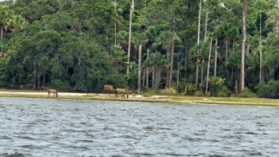 We anchored just inside the channel to the west of Cumberland Island. Then we saw something moving on the island. Then we saw a lot of somethings moving on the island. Wild horses!