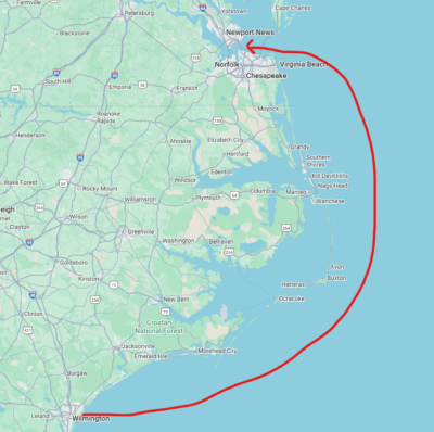 This area can be tricky because the weather can whip around the point and there are lots of obstacles closer to the shore. We went around it and headed for Norfolk, Virgina in the Chesapeake Bay.